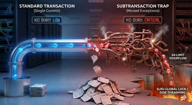 So why is misplaced EXCEPTION logic possibly a performance killer? PostgreSQL is optimized to handle a small number of open subtransactions very efficiently. Each backend process has a fixed-size array in shared memory (part of the PGPROC structure) that can hold up to 64 open subtransaction IDs (XIDs) for the current top-level transaction. As long as your nesting depth stays below 64, PostgreSQL manages everything in this fast, local memory array. It does not need to use the Subtrans SLRU (Simple Least Recently Used) subsystem, which is what pg_stat_slru tracks. The problem is that the utilization of subtransaction IDs (XIDs) can get out of hand rather quickly if you are not paying attention to your application flow and once PostgreSQL runs out of fast RAM slots (PGPROC array) and spills tracking data to the slow SLRU cache (pg_subtrans), performance degrades non-linearly (often 50x–100x slower) and causes global locking contention that can freeze other users.